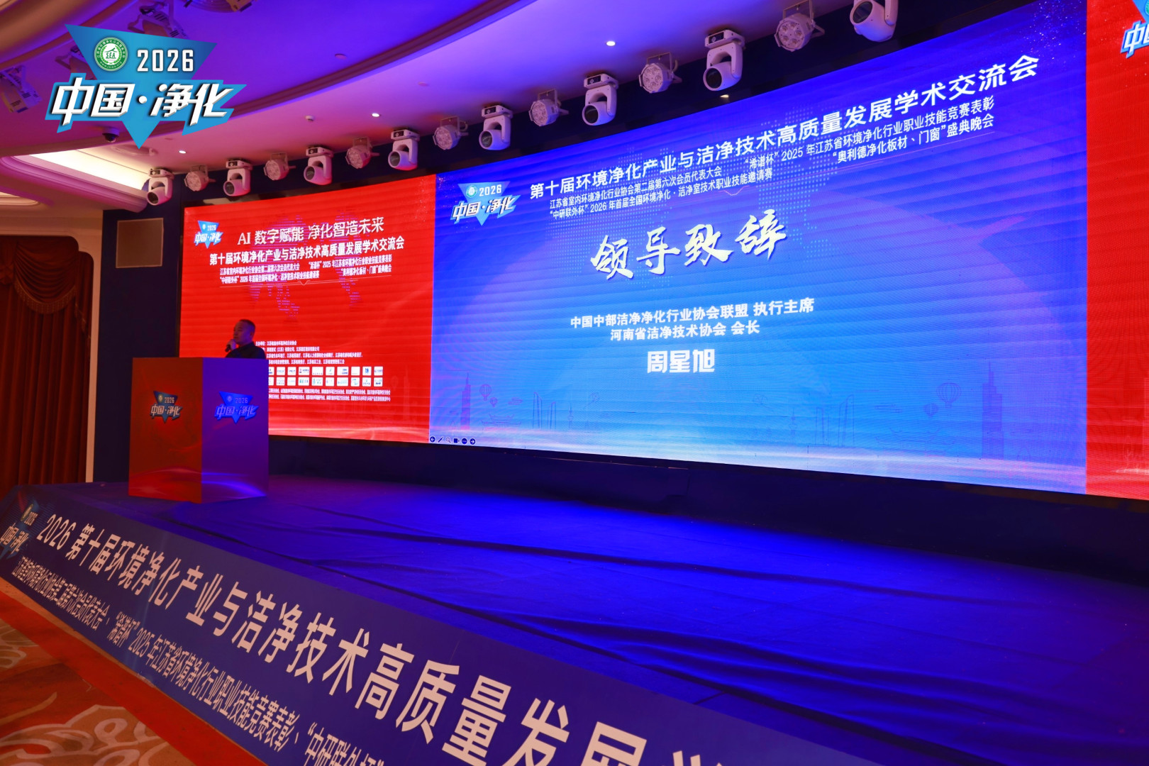 在贺辞中,周星旭会长首先对大会的成功举办表示热烈祝贺,向长期以来深耕洁净技术领域的行业同仁致以诚挚问候。他指出,洁净技术作为高端制造业“低碳化、智能化”转型的核心支撑,其升级迭代直接决定着产业生产精度、合规水平与低碳效益,在“健康中国2030”战略落地与全球制造业转型升级的双重背景下,行业正迎来从“传统制造”向“智慧服务”转型的关键机遇期。当前,AI技术加速渗透室内环境净化行业,从智能监测、精准净化到智能运维,正推动洁净生产向“实时感知-智能决策-主动预防”的新模式升级,为生物制药、医疗健康、高端电子等领域提供更高效的洁净解决方案。
