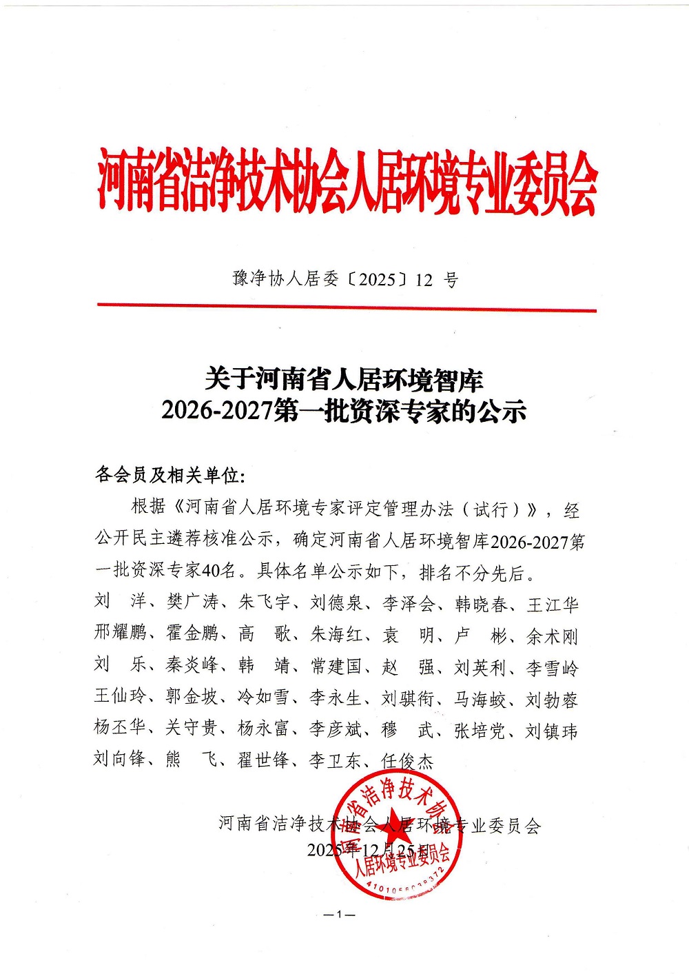 关于河南省人居环境智库2026-2027第一批资深专家的公示